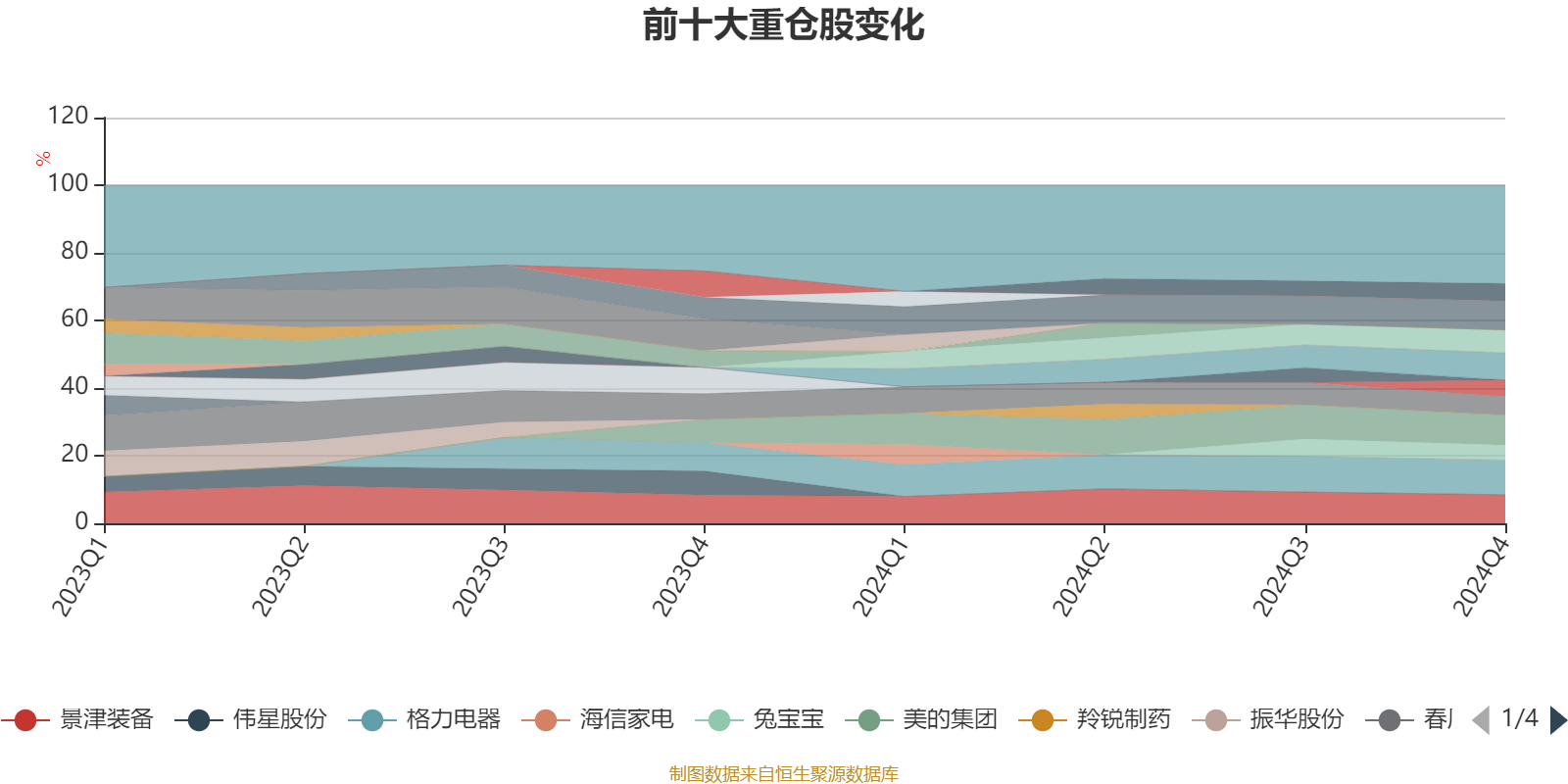 该基金持股集中度较高,近2年前十大重仓股集中度长期超过60%。截至2024年末,基金十大重仓股分别是格力电器、美的集团、凌霄泵业、景津装备、渝农商行、招商银行、春风动力、济川药业、天地科技、兔宝宝。